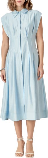 Pleats at the bodice give an hourglass shape to this fit-and-flare shirtdress that's lightweight and versatile.