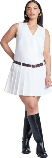 A belted mini with soft pleats, a V-neckline, and a flattering relaxed silhouette.