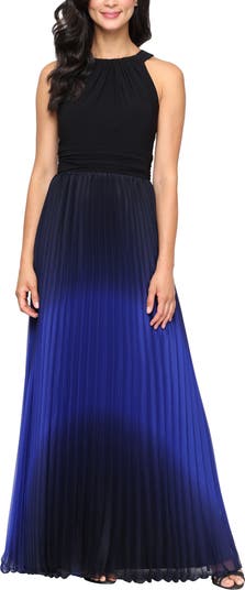 Gathering at the neckline and waist create stunning dimension on a captivating gown balanced by an ombré-patterned skirt with soft pleats for fluid movement.