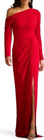 Full of striking sophistication, this shoulder-baring gown features sharp pleats that shape and drape, and a daring side slit for eye-catching appeal.
