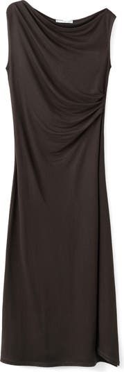 Rippled ruching adds texture and shape to this figure-skimming midi made in a shoulder-showing silhouette.
