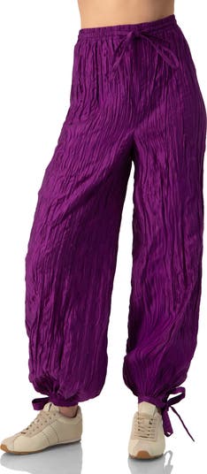 Wide-leg pleated pants with elastic waistband, featuring adjustable ties at the ankles and waist for a customizable fit.