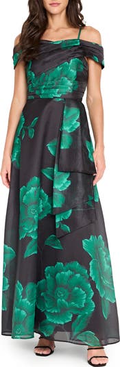 Verdant photorealistic blooms romance this shoulder-baring gown made with a pleated bodice and supportive adjustable straps. A dramatic waistline drape and a flared A-line skirt punctuate this evening-out look.