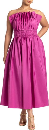 A compliment magnet for obvious reasons, this midi dress features a statement pleated bodice & cinched waist that extends to a gathered hem. Equal parts polished & photo op-ready, it’ll be a crowd pleaser wherever you wear it.