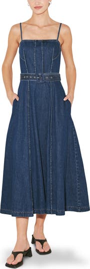 Seaming through the bodice brings detailed structure to this square-neck dress cinched with a waist-defining self belt and flowy midi-length skirt.