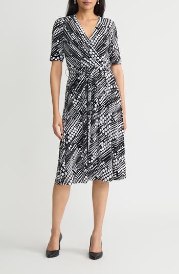 This desk-to-dinner dress has drapey pleats at the bodice and a removable tie belt at the waist.