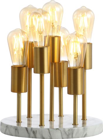 Modern Glam is here, with this unique accent lamp in gold and marble finishes. Seven Edison-style lights clustered on a marbled base give plenty of warm, bright light. The brass-gold finish is perfect for a contemporary living room, office, dining room, or even a bathroom vanity. The elegant, silk-wrapped cord has an in-line switch.