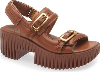 Buckled straps enhance the voluminous silhouette of this lightweight sandal set on a carved platform and heel inspired by natural textures like dandelion heads and mushroom gills.