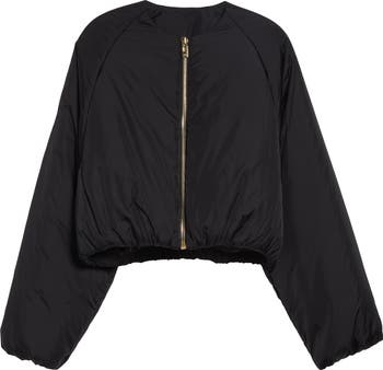 A cocoon-inspired silhouette defines this collarless bomber jacket designed with raglan sleeves and a gathered hem.