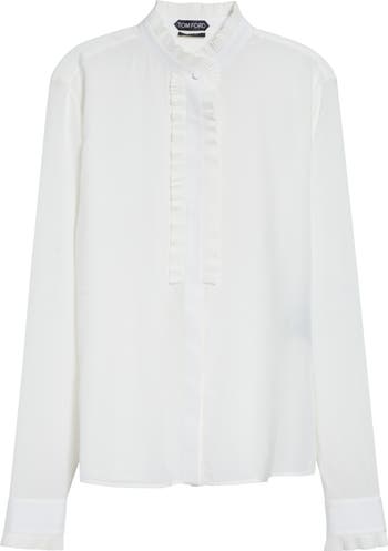 Minuscule pleats form a fine ruffle that frills the collar, placket and cuffs of this silk crêpe de chine shirt that's simply elegant on its own or layered with tailored pieces.