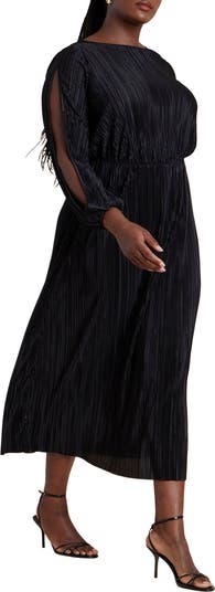 An easy satin-plissé midi with a boat neck, elastic waist, long sleeves, and a fluid side slit.