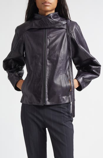 Paloma Lanna contemplates clothing as protection for fall '25, building everyday armor from sleek separates like this glossy Spanish-leather jacket with crisscrossed panels secured at the shoulder with silvery D-ring hardware.