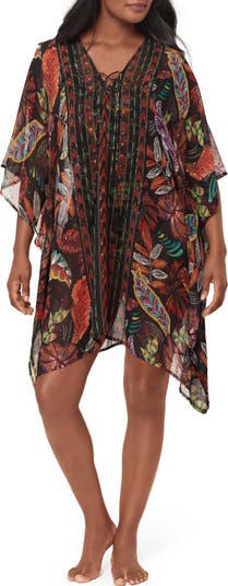 Cut from airy chiffon, this drapey cover-up is covered in a vivid vacation-perfect print and adorned with shimmering metallic accents.