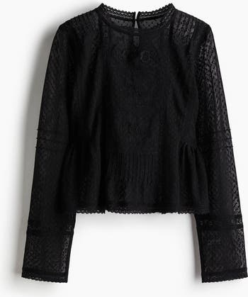 Long-sleeved blouse in plumeti mesh detailed with lace insets, embroidered motifs and pintucks. Round neckline and a keyhole opening with a button at the back, and gathers at the sides of the waist to create a gently flared hem.