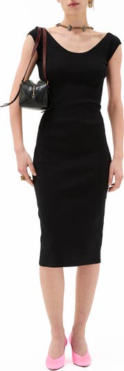 This body-hugging cotton-blend dress is knit with a wide scoop neck, cap sleeves and a dramatic plunging back accented with a Medusa stud.
