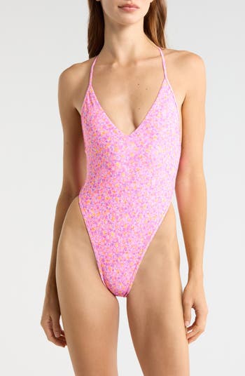 Take a dip in this printed one-piece swimsuit styled with a quick-drying fabric and adjustable ties that wrap around the back.