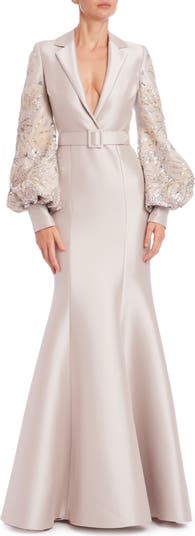 Plunge Neck Beaded Long Sleeve Trumpet Gown