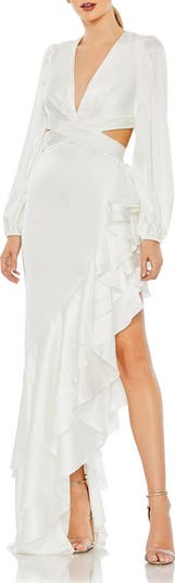 Plunge Neck Cut Out Asymmetrical Ruffle Gown