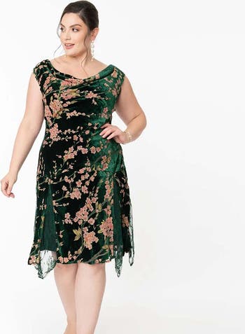 We’re going Gatsby, darling! With this graceful Hemingway Flapper from Unique Vintage, you can achieve that ideal 1920s look in marvelous style. This fabulous velvet frock features a fitted shape with a gentle cowl draping across the neckline and back. Panels of emerald green lace are situated between the pleats of the drop waist skirt, while pink florals cascade throughout the emerald green velvet. Fully lined in an easy pull over design!