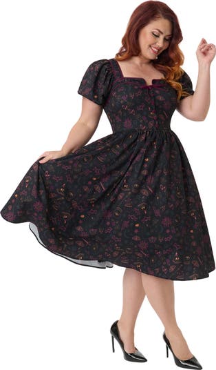 This adorable plus size 1940's style swing dress is crafted in a lightweight woven fabric. The bodice features a faux button up front topped with a cute bow and is framed by short elastic puff sleeves. Complete with a back zipper to cinch the waist.
