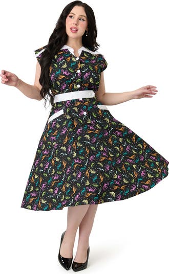 The plus size Hedda Dress from Unique Vintage is cast in a lightweight woven fabric. A modest V-neck is styled with a classic lapel collar that flares out to the sweet cap sleeves. The A-line swing skirt sweeps to your knees and features adorable front pockets and button sash belt.