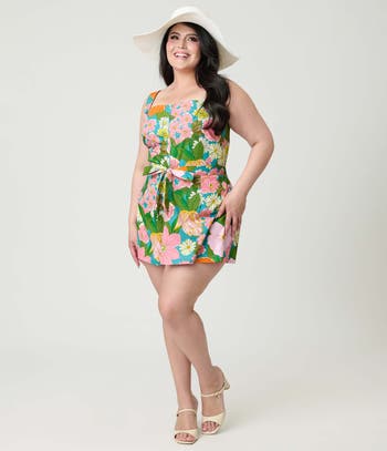 This darling 1960s style romper is crafted in a sturdy woven fabric. Outfitted with a front zipper, button adjustable straps, and an attached skirt over the sweet shorts!
