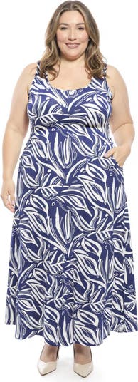 Elevate warm weather style with this plus size elegant sleeveless maxi dress from 24seven Comfort Apparel, designed with a navy nature inspired abstract print accented by vibrant red. The scoop neckline and flowy A line silhouette create easy comfort, while pockets add function. Soft stretch fabric is machine washable and tumble dry. Pair with wedges for a polished look.