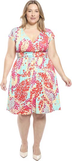 Plus Size Abstract V-Neck Cap Sleeve Knee Length A-Line Pocket Dress