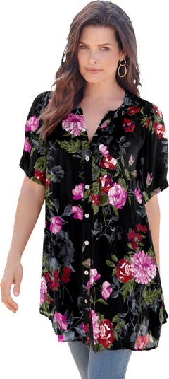 The Women’s Plus Size Angelina Crinkle Crepe Short Sleeve Tunic features lightweight hand-crinkled crepe fabric, a flattering Y-neckline, and a longer-length silhouette. Designed with a flowy, draped fit and feminine shirring details, it offers breathable comfort and effortless styling with leggings or slim pants.