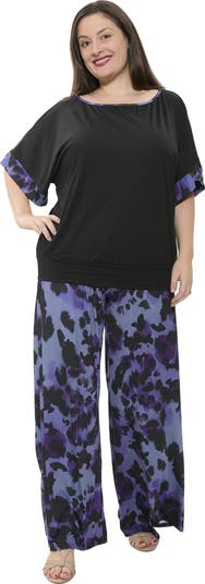 Make a bold statement with this plus size two piece pant set from 24seven Comfort Apparel featuring a striking animal print. The boat neck top with wide short sleeves creates an effortlessly chic look, while the wide leg palazzo pants with an elastic waistband ensure all day comfort. Crafted from soft, breathable fabric, this stylish set is machine washable and tumble dry for easy care.