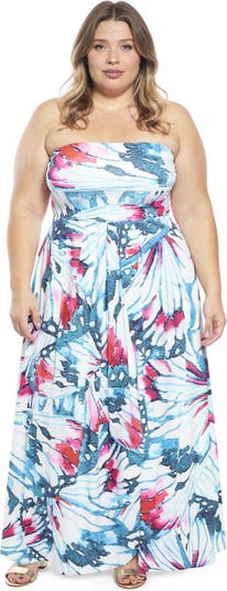 Make a bold entrance in this plus size blue oversized butterfly print print A line strapless maxi dress from 24seven Comfort Apparel. The pleated silhouette flows with ease, while hidden pockets add practical charm. The cool multicolor pattern brings relaxing energy, perfect with sandals or wedges for warm weather outings. Machine washable and tumble dry for easy care.