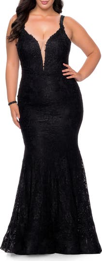 On trend form fitting lace curvy prom dress with dramatic plunging neckline. This design features all over scattered rhinestones and a criss cross open back. Back zipper closure.
