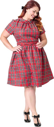 This darling dress from Smak Parlour is crafted in a sturdy woven fabric , the fitted bodice leads to a fold over funnel neck collar and is framed by short sleeves. The waist is nipped in by a matching belt, while the flare skirt dances above your knees and features side pockets hidden in the seams!