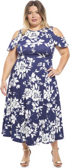 This plus size navy floral print A line maxi dress from 24seven Comfort Apparel is enhanced with stylish ruffle cold shoulder sleeves for a modern touch. Featuring a modest round neckline, full ankle length, and a wide, flowy skirt, it offers effortless elegance. Made from soft, comfortable stretch fabric, it is machine washable and tumble dry for easy care.