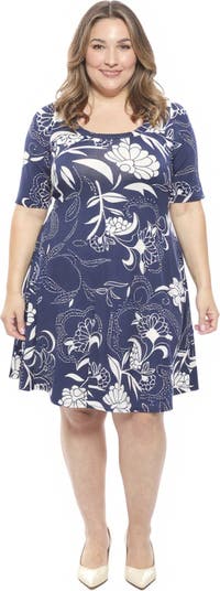 Elevate your wardrobe with this 24seven Comfort Apparel plus size navy floral print A-line dress, featuring a flattering scoop neckline and three-quarter sleeves. The soft flare hemline and slim fit waist create a flattering silhouette, while the midi length adds timeless elegance. Crafted from a comfortable stretch fabric, this versatile, machine-washable dress is perfect for layering or wearing on its own, making it a staple for every season.