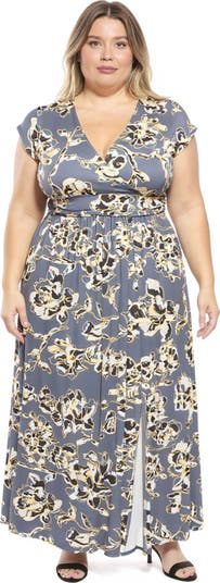 Elevate your wardrobe in this 24seven Comfort Apparel plus size grey floral print V neck maxi dress, where playful charm meets effortless elegance. Designed with a long, floor length A line silhouette and cap sleeves, it flatters your shape while offering graceful movement. Crafted from a soft, lightweight polyester blend, it ensures comfort from day to night. Pair it with heels and silver jewelry for a polished look, and enjoy easy machine washable care.
