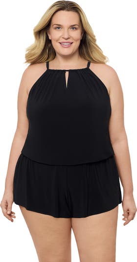 Plus Size Keyhole Blouson Slimming Swimsuit Romper with Pockets