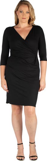 Ever polished and chic, this fashionable style features an elegantly draped front gathered at the waist. The long sleeves and classy v-neck make this plus size dress a must have for any professional’s closet.