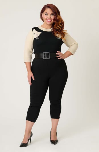 This sweet 1950s style plus size knit sweater is crafted in a silky soft knit fabric while the contrasting three-quarter length sleeves offer a kitschy design.