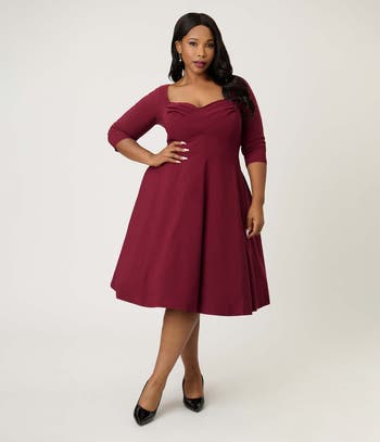 This charming 1950s swing dress features a flattering sweetheart neckline and elegant three-quarter length sleeves that create a timeless silhouette. The pleated bust adds just the right touch of vintage flair. With its classic black hue, this dress effortlessly transitions from day to night.