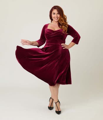 This charming 1950s swing dress features a flattering sweetheart neckline and elegant three-quarter length sleeves that create a timeless silhouette. The pleated bust adds just the right touch of vintage flair. With its classic black hue, this dress effortlessly transitions from day to night.