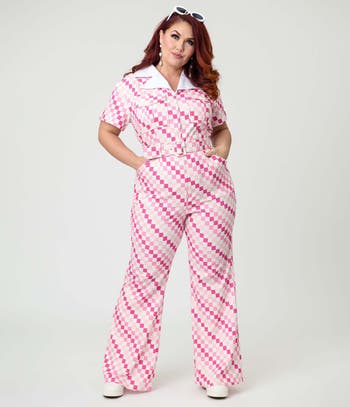This adorable 1970's style jumpsuit is crafted in a brilliant woven blend. Featuring a matching belt to cinch the waist and complete with a front zipper and side, back, and front pockets!