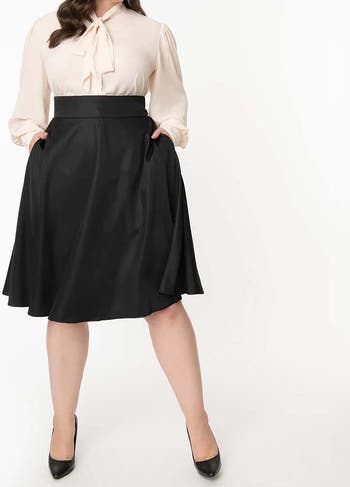 An exquisite plus size 1950s reminiscent swing skirt that rests high on the natural waist, the Vivien skirt is a chic stunner! Fabulously exclusive to Unique Vintage, featuring functional side pockets, thick banding and a back zipper and metal double hook closure. It's picturesque perfection!
