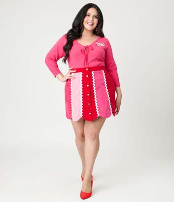 This darling plus size corduroy mini skirt features a scallop hem border. Outfitted with a button up front and side pockets.