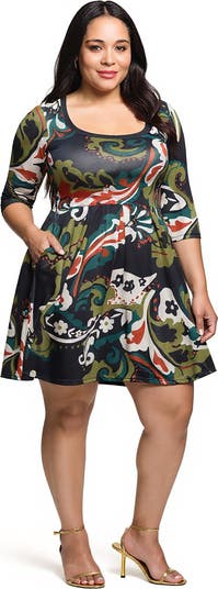Stand out in vibrant style with this green paisley plus size fit and flare dress. The lively pattern adds a playful yet sophisticated touch while the scoop neckline and three quarter sleeves provide balance. Designed with a flattering flare and knee length cut, this dress also features pockets for a practical finish.