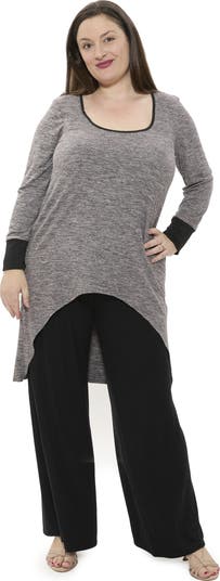 Step out in style with this plus size two tone pant set from 24seven Comfort Apparel. The scoop neck high low tunic top features a heathered finish that softly complements the solid color palazzo pants, creating a stylish two tone look. Designed with long sleeves and matching banded cuffs, this set offers a relaxed flattering fit with an elastic waistband. Made from soft stretch fabric, it is machine washable for easy care.