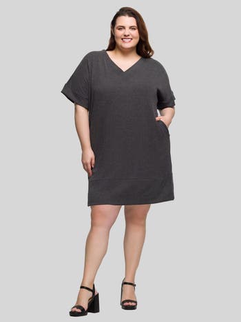 Elevate your casual wardrobe with this plus size mini T shirt dress from 24seven Comfort Apparel. Designed for effortless style and all day comfort, it features a flattering V neckline, short sleeves, and a relaxed loose fit that drapes beautifully. Functional pockets add convenience, while soft, breathable fabric ensures comfort. Machine washable and tumble dry. Perfect with sneakers for casual outings or sandals for laid back days at home.