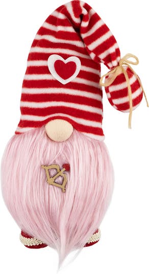 This adorable little gnome is dressed for the occasion, wearing a delightful pink and red striped hat adorned with a heart. Holding a tiny bow and arrow, our Valentine's Day gnome is ready to play Cupid and shoot love into the air. Place him on your mantel, shelf, or tabletop to create a delightful centerpiece for your Valentine's Day celebrations or gift it to special someone. Product Features: P Valentine's Day gnome Wearing a red and pink striped hat decorated with a heart Comes with a cupid bow and arrow attached to his beard Wearing red shoes accented with hearts Weighted bottom for stability Recommended for indoor decorative use only Dimensions: 19"H X 5.5"W X 4.5"D Material(s): fabric/wire/faux fur/foam