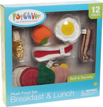 Your child can create their own nourishing play brunch with this 12-piece set of plush food pieces. The set includes everything they'll need from bread to eggs, tomato slices and a hot dog.