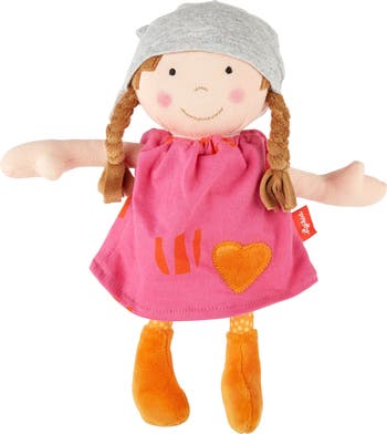 Just perfect to be your little one's first play pal. The supple fabric doll keeps your baby comforting company and accompanies your toddler on his little daily adventures. The dress can be removed, whereas the pointed cap is fixed. Fuzz-free plush plaits, soft velours body and feet and jersey arms invite to hug. The smooth print fabric used for the legs looks just like colorful tights. This cute little soft dolly will last through an awful lot of snuggles!